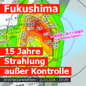 Unter dem Motto: Fukushima – 15 Jahre Strahlung außer Kontrolle findet am Mittwoch, den 11. März um 19 Uhr eine Kundgebung vor dem Tor 1 des Atomkraftwerks Neckarwestheim statt.